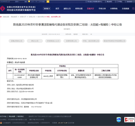 河北光源太陽(yáng)能科技有限公司憑借完善細(xì)致的服務(wù)成功中標(biāo)隆堯縣2020年農(nóng)村冬季清潔取暖電代煤設(shè)備采購(gòu)及安裝(二標(biāo)段:太陽(yáng)能+電輔助)。中標(biāo)喜訊紛至沓來(lái),彰顯了本公司專業(yè)的施工實(shí)力與良好的市場(chǎng)口碑。